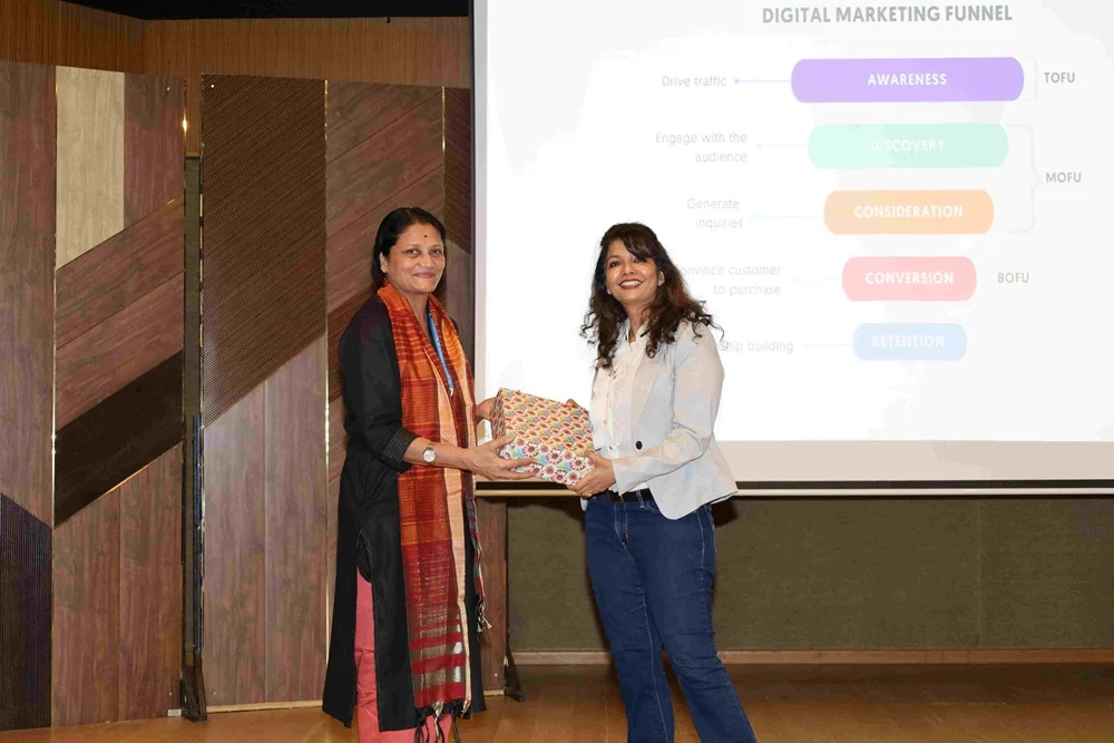 Ms. Bhatnagar’s engaging session provided students with a comprehensive understanding of branding, communication, and the modern marketing funnel. She explained how consistent and value-driven communication builds trust, visibility, and loyalty, forming the foundation of strong customer relationships.