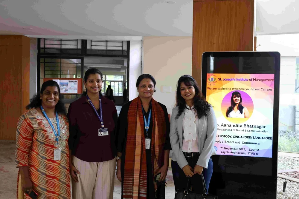 The Department of Marketing at St. Joseph’s Institute of Management (SJIM) organized a Guest Lecture on Brand & Communication on November 7, 2025. The session was coordinated by Dr. Jessy Nair, Associate Professor & Area Coordinator – Marketing, and delivered by Ms. Aanandita Bhatnagar, an accomplished marketing leader with extensive global experience in marketing communications, brand strategy, and B2B marketing.