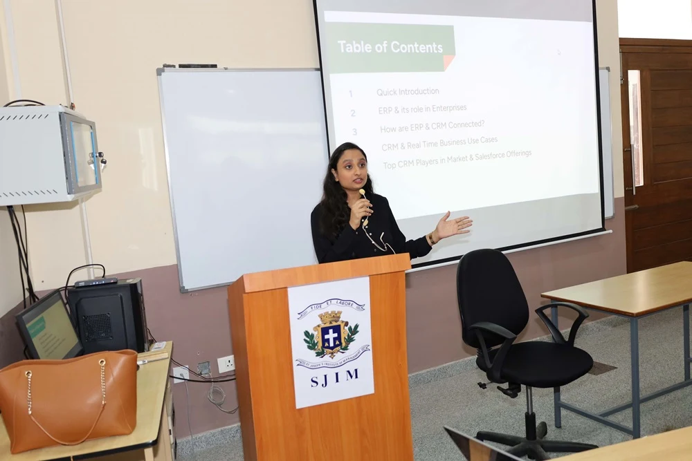 The Department of Management at St. Joseph’s Institute of Management (SJIM) organized an insightful guest lecture on “CRM Applications and Their Role in Modern Business” by Ms. Gnanavi, Senior Account Manager at Elastic. With over seven years of professional experience in leading organizations such as Freshworks and Salesforce, Ms. Gnanavi shared valuable perspectives on how Customer Relationship Management (CRM) and Enterprise Resource Planning (ERP) systems are transforming modern businesses.