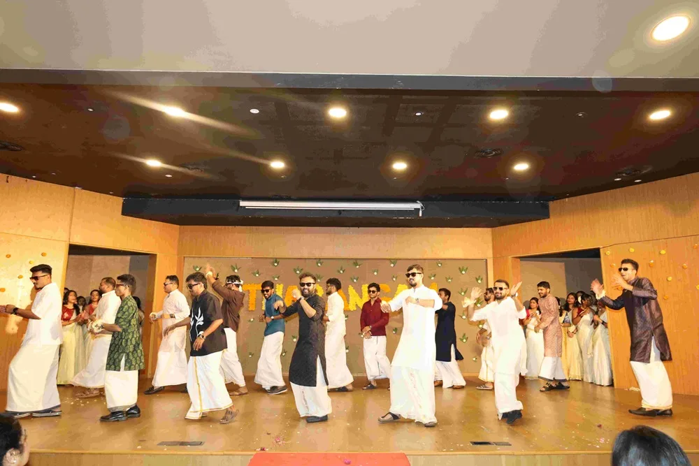 The day began with the rhythmic Chenda Melam that set the festive spirit in motion. This was followed by the traditional lamp lighting ceremony, a graceful Thiruvathira dance, and the symbolic presence of King Mahabali, reminding us of the true essence of OnamStudents from both first and second year showcased their talent through soulful music and energetic dance performances, filling the atmosphere with enthusiasm. The much-awaited Onasadhya, a feast from the kitchens of Kerala, delighted everyone with its authentic flavors of God’s Own Country.