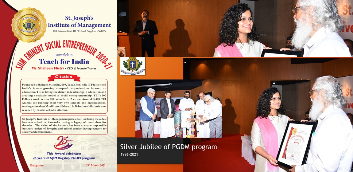 St. Joseph's "SJIM Eminent Social Entrepreneur of the Year" is awarded to Teach For India for the year 2020-21.