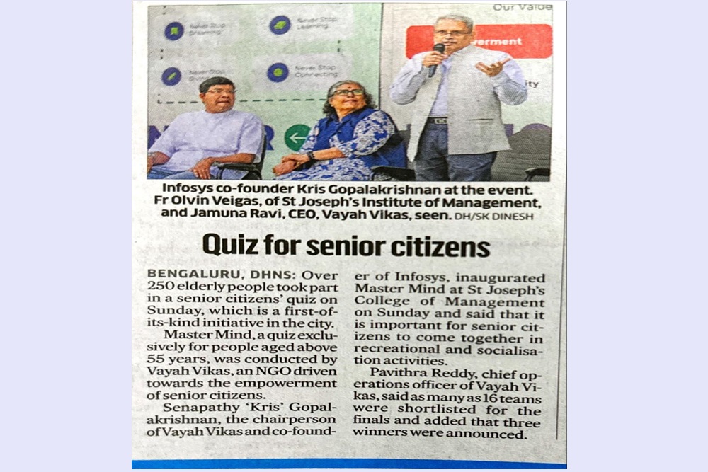 The Kannada saying βππππππππ, ππππππππβ aptly describes when it comes to the works of Vayah Vikas, an NGO which works for the empowerment of the senior citizens of Bangalore. In the fast-paced world, our seniors are mostly left behind to catch up with the trends of today. Vayah Vikas has been helping the seniors in various ways to be part of their journey. Recently, Vayah Vikas organised "Master Mind Quiz" for the seniors in order that they are up-to-date at the St Joseph's Institute of Management - SJIM, Bangalore.