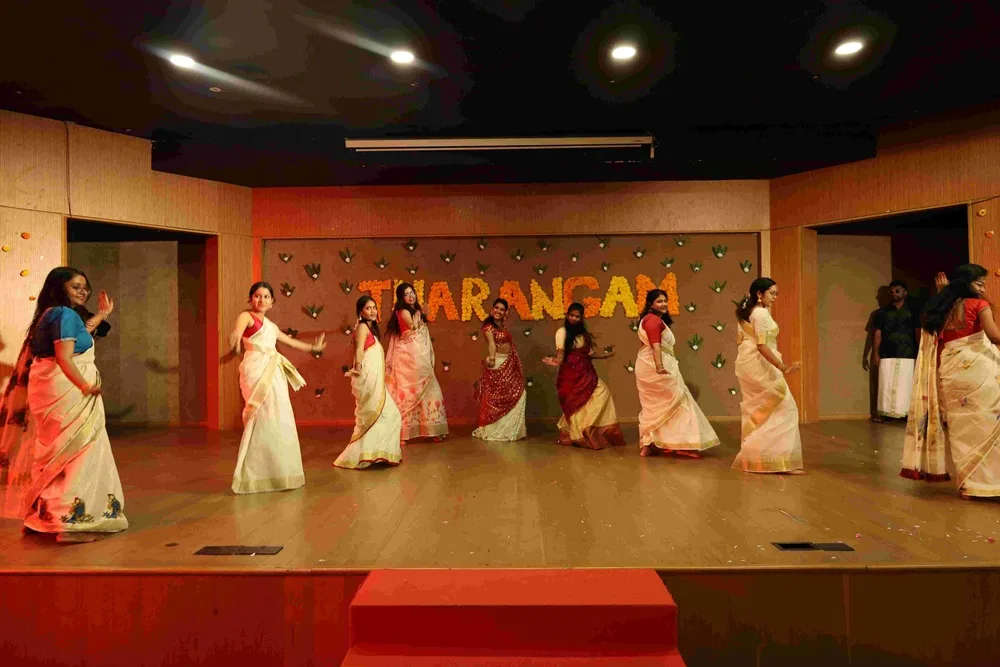 The day began with the rhythmic Chenda Melam that set the festive spirit in motion. This was followed by the traditional lamp lighting ceremony, a graceful Thiruvathira dance, and the symbolic presence of King Mahabali, reminding us of the true essence of OnamStudents from both first and second year showcased their talent through soulful music and energetic dance performances, filling the atmosphere with enthusiasm. The much-awaited Onasadhya, a feast from the kitchens of Kerala, delighted everyone with its authentic flavors of God’s Own Country.